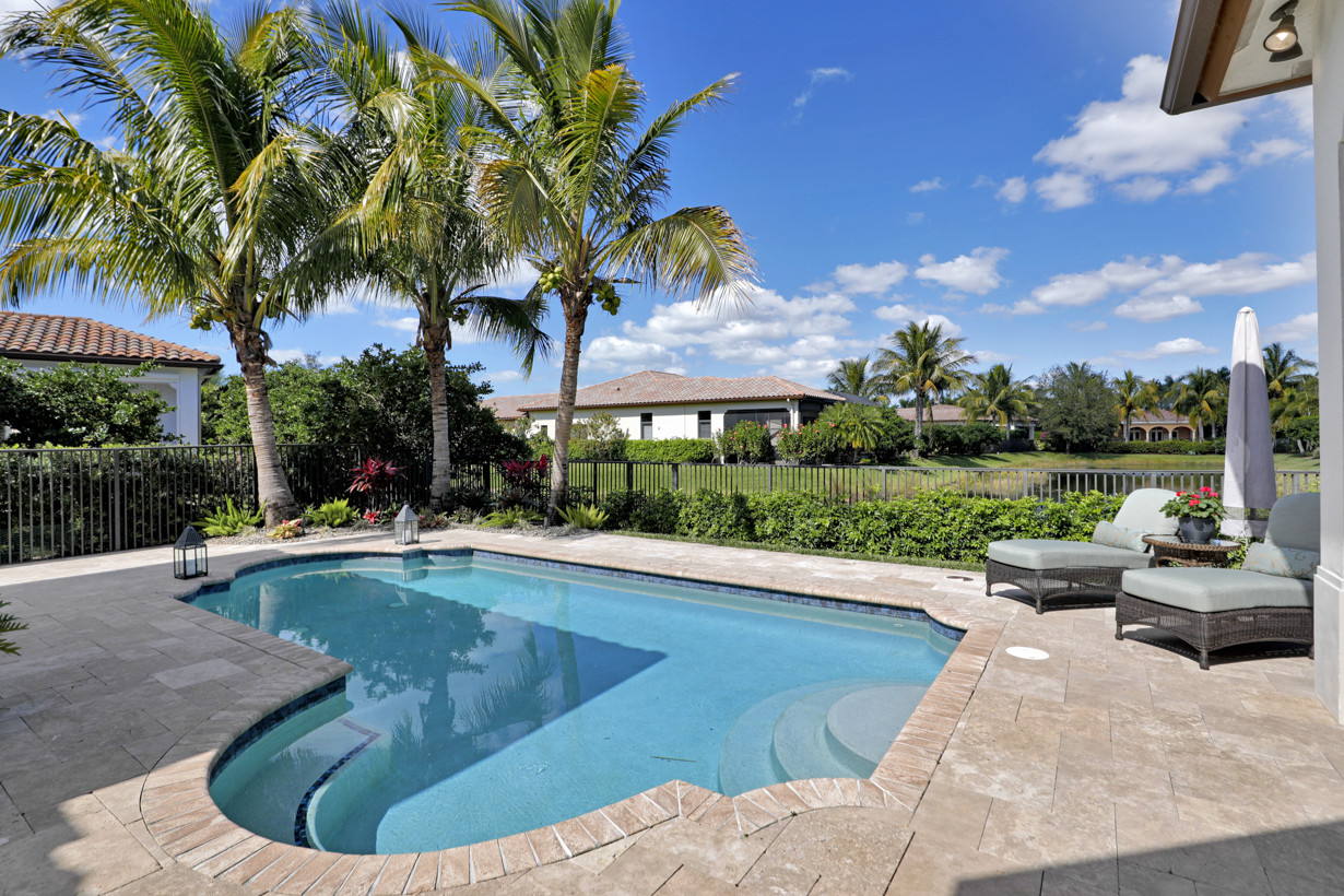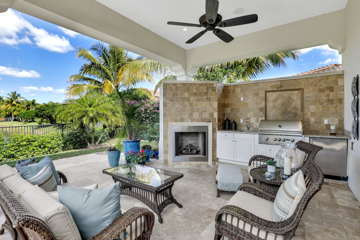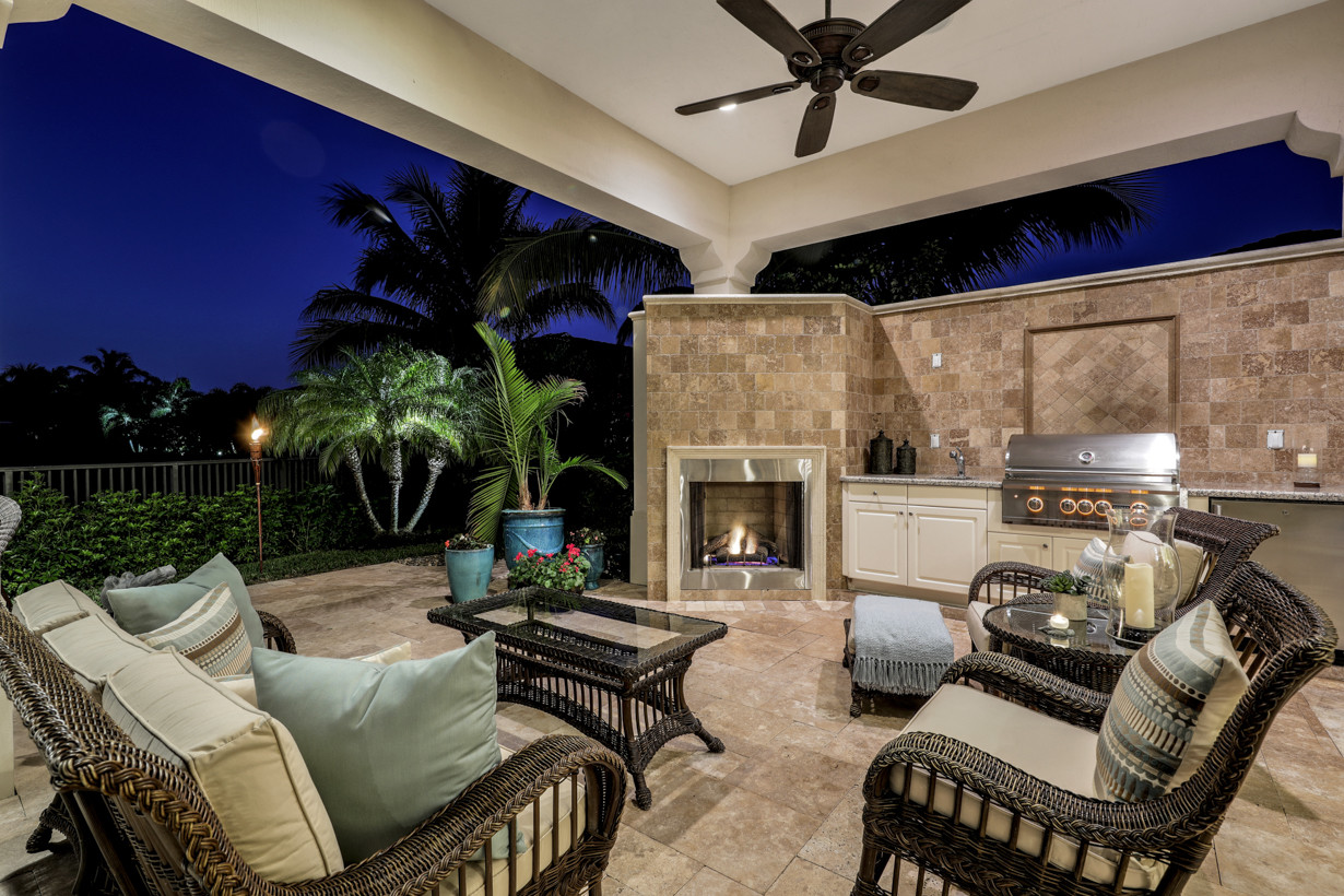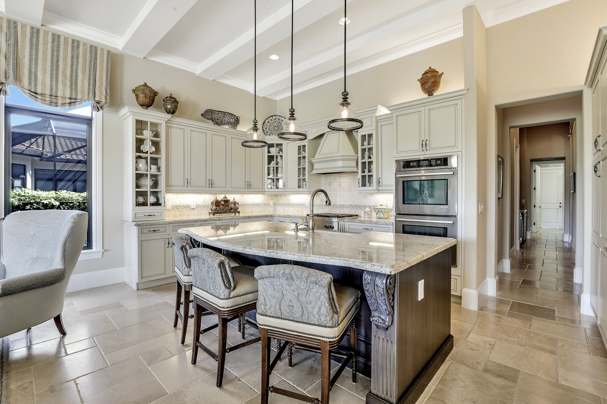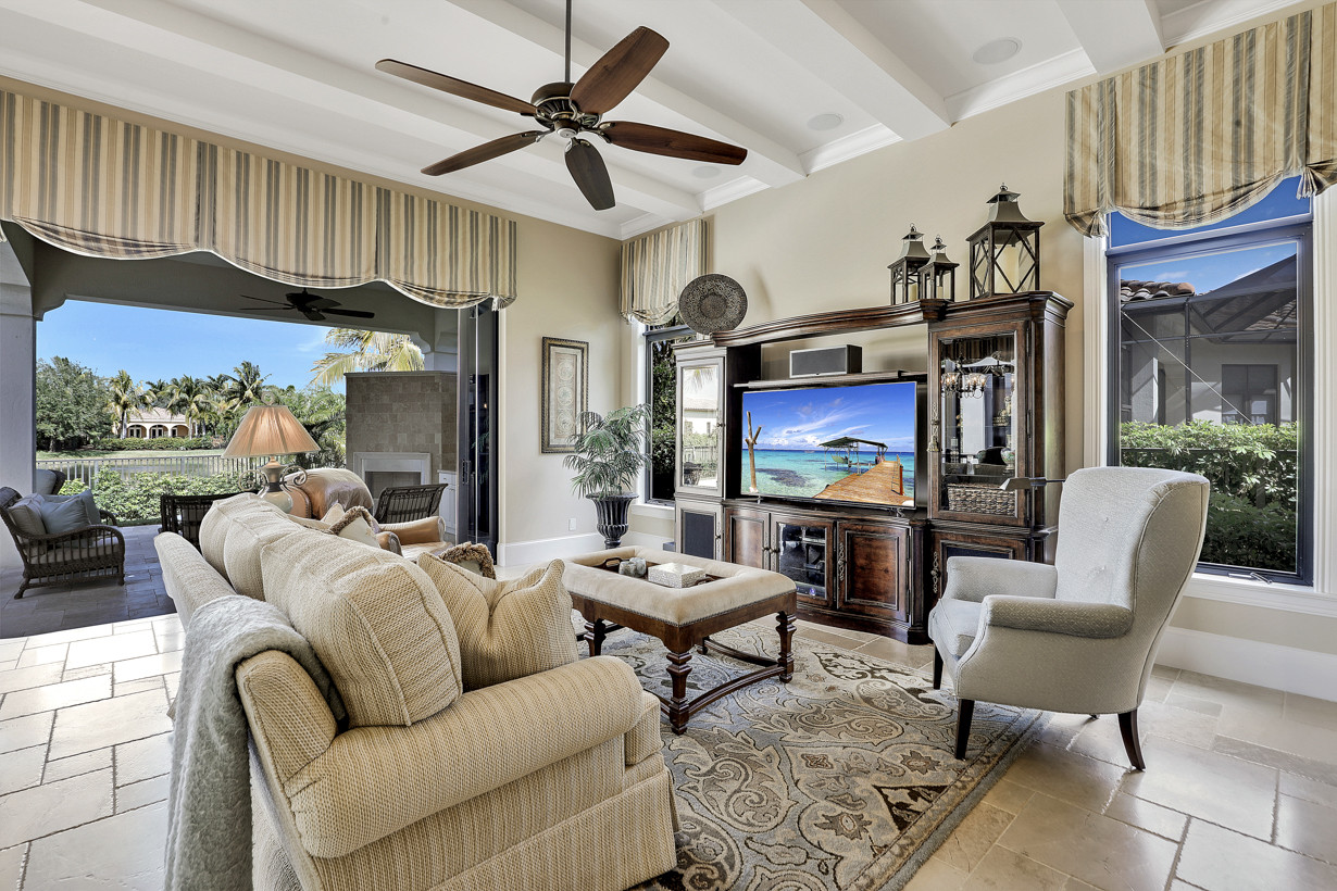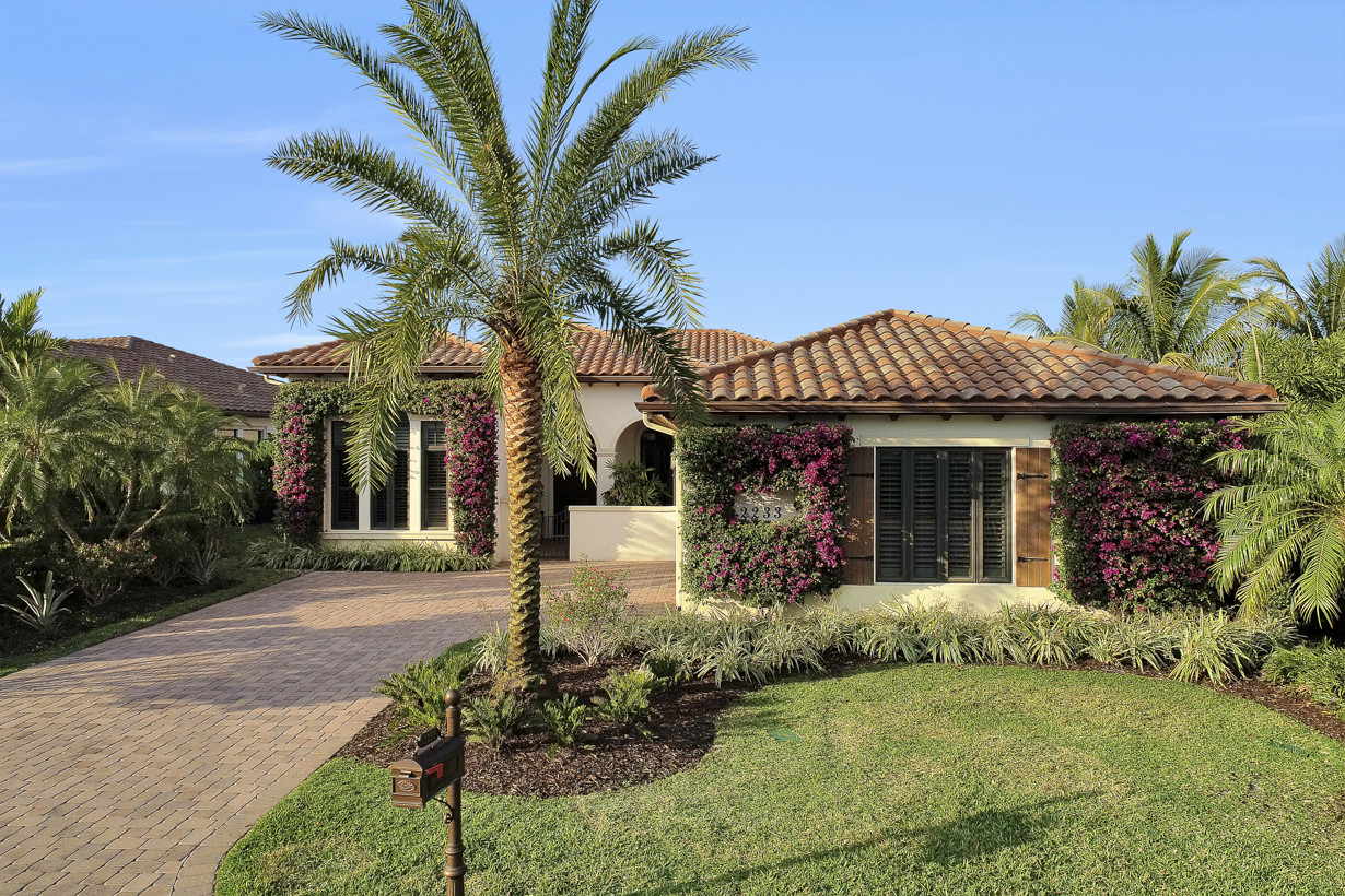 Lush tropical landscaping with palm tree up-lighting resides on deep, over-sized lot and has bonus Cul-De-Sac green-space median! Multiple upgrades include expanded marble lanai deck with saltwater pool, gas fireplace and grill. Surround sound and full outdoor kitchen among-st quiet, private setting and long lake views. Bright indoor kitchen flaunts gas cook-top, upgraded paneled appliances and cabinets with roll out shelves! Entertaining butlers pantry with wine storage and cooler. Master bath relaxes with massage spray system, large soaking tub, decorator tile accents and vanity! Large, quiet den has rich wood floors and plantation shutters. In addition, extended French limestone floors, crown molding, custom (electric) window treatments and draperies, custom closets, On Q wiring system and fresh paint! Impact windows and doors plus roof strengthening tie down and clip package. Functional 2 1/2 car garage with A/C, cabinets, electric bike lift and new epoxy floor! World class golf and Country Club!