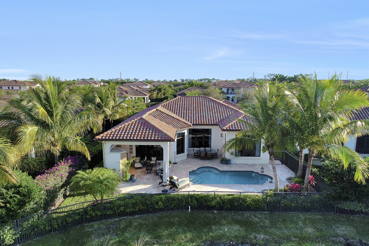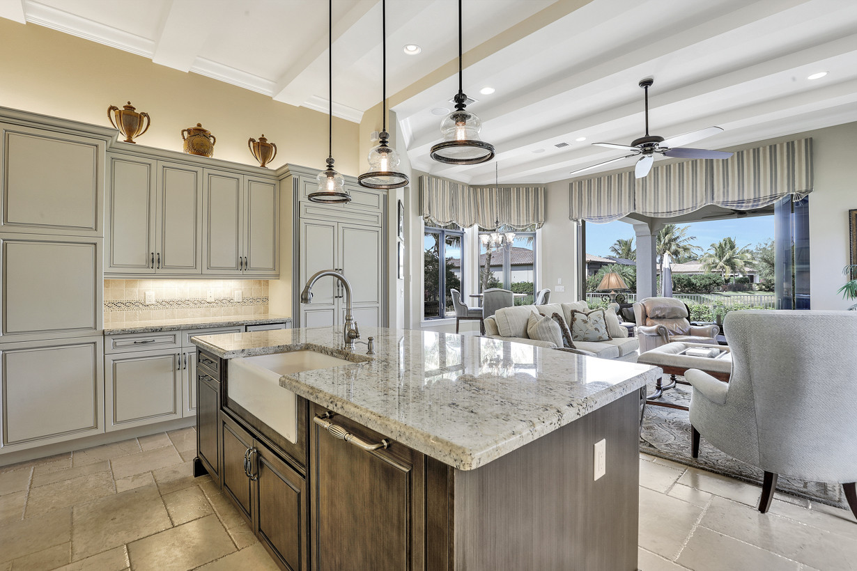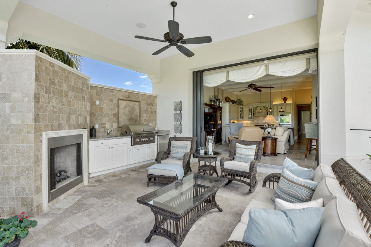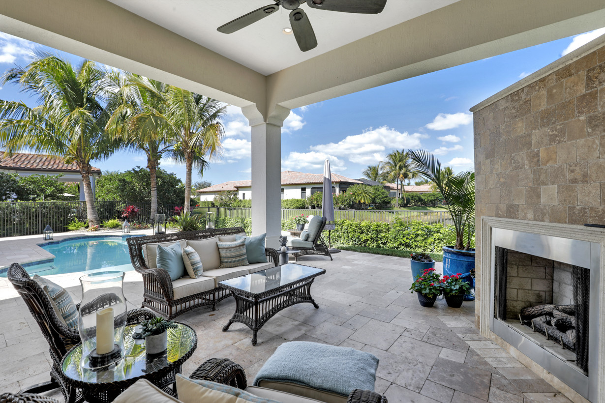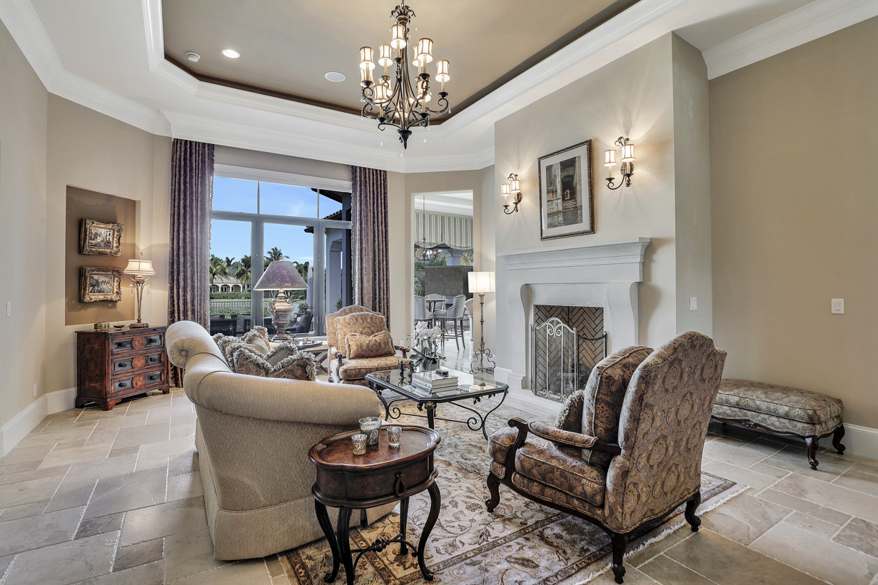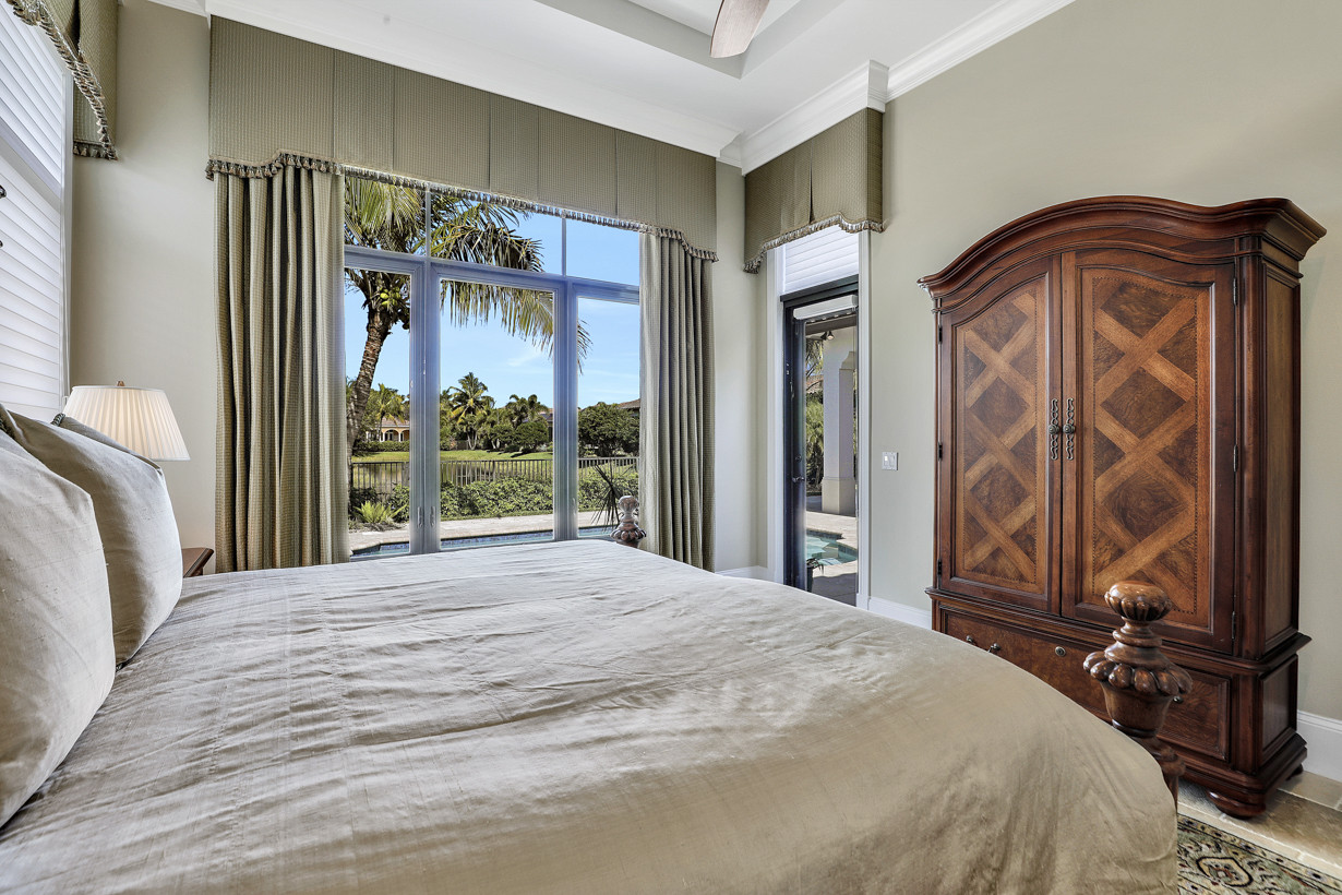 Lush tropical landscaping with palm tree up-lighting resides on deep, over-sized lot and has bonus Cul-De-Sac green-space median! Multiple upgrades include expanded marble lanai deck with saltwater pool, gas fireplace and grill. Surround sound and full outdoor kitchen among-st quiet, private setting and long lake views. Bright indoor kitchen flaunts gas cook-top, upgraded paneled appliances and cabinets with roll out shelves! Entertaining butlers pantry with wine storage and cooler. Master bath relaxes with massage spray system, large soaking tub, decorator tile accents and vanity! Large, quiet den has rich wood floors and plantation shutters. In addition, extended French limestone floors, crown molding, custom (electric) window treatments and draperies, custom closets, On Q wiring system and fresh paint! Impact windows and doors plus roof strengthening tie down and clip package. Functional 2 1/2 car garage with A/C, cabinets, electric bike lift and new epoxy floor! World class golf and Country Club!