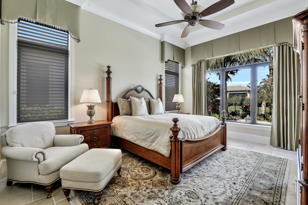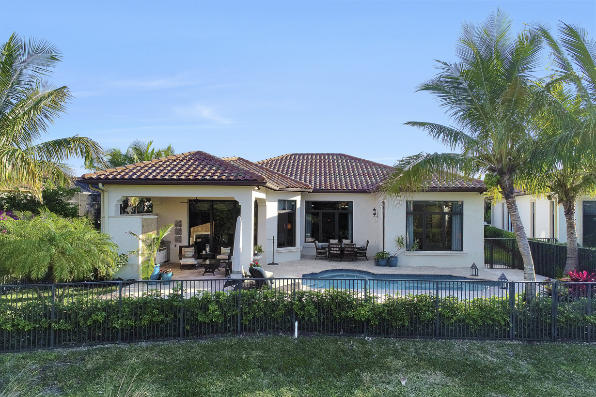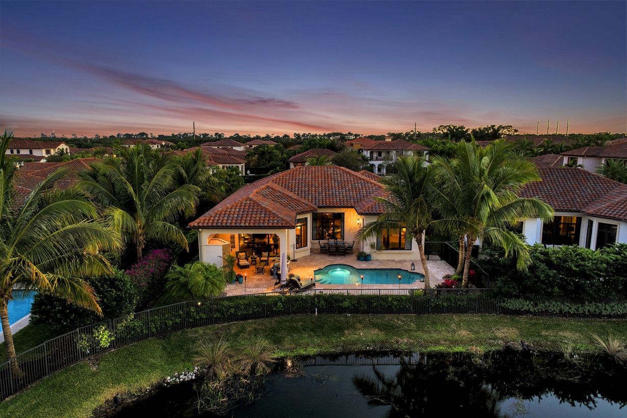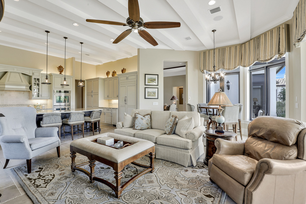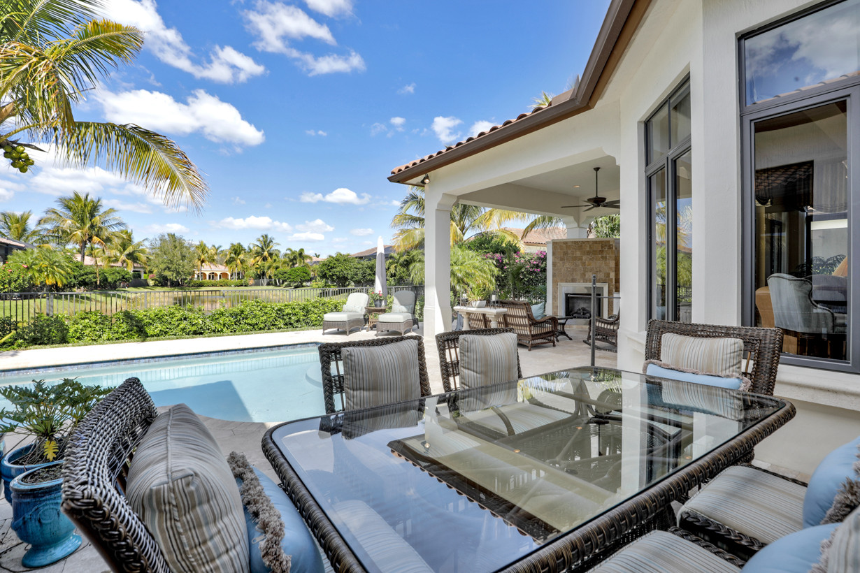 Lush tropical landscaping with palm tree up-lighting resides on deep, over-sized lot and has bonus Cul-De-Sac green-space median! Multiple upgrades include expanded marble lanai deck with saltwater pool, gas fireplace and grill. Surround sound and full outdoor kitchen among-st quiet, private setting and long lake views. Bright indoor kitchen flaunts gas cook-top, upgraded paneled appliances and cabinets with roll out shelves! Entertaining butlers pantry with wine storage and cooler. Master bath relaxes with massage spray system, large soaking tub, decorator tile accents and vanity! Large, quiet den has rich wood floors and plantation shutters. In addition, extended French limestone floors, crown molding, custom (electric) window treatments and draperies, custom closets, On Q wiring system and fresh paint! Impact windows and doors plus roof strengthening tie down and clip package. Functional 2 1/2 car garage with A/C, cabinets, electric bike lift and new epoxy floor! World class golf and Country Club!
