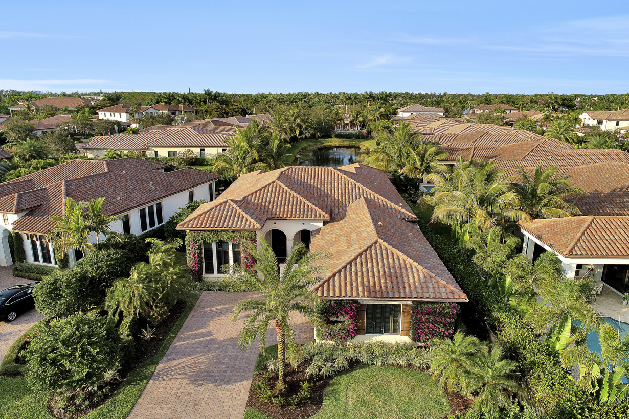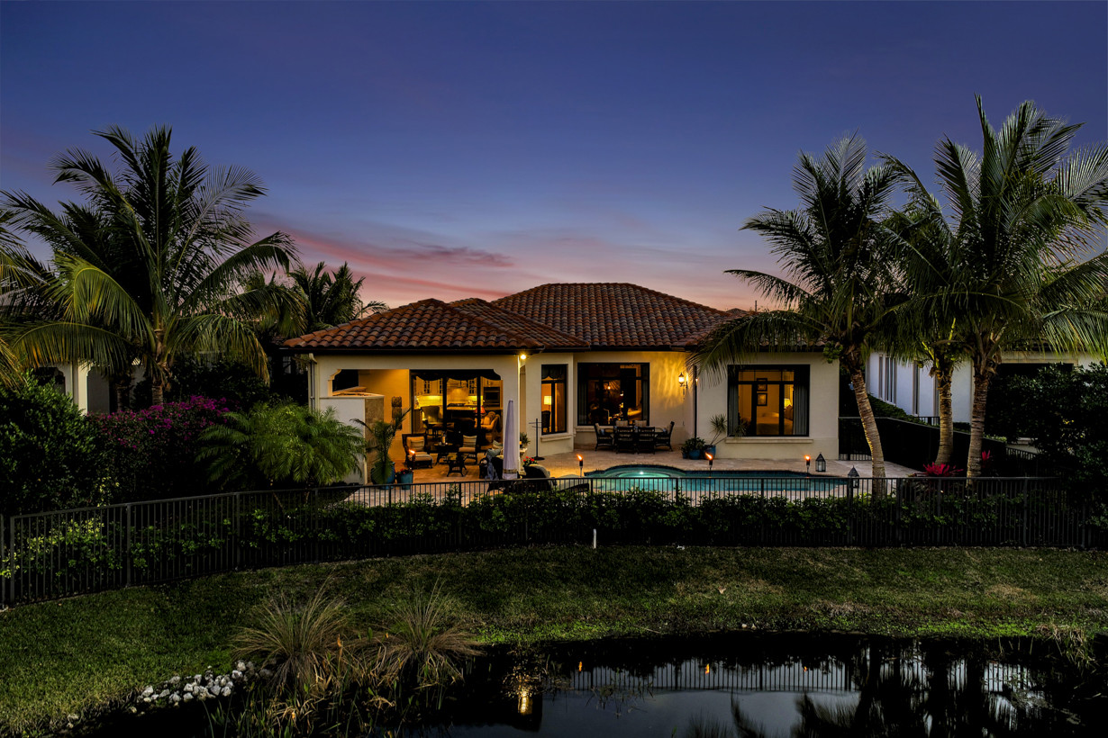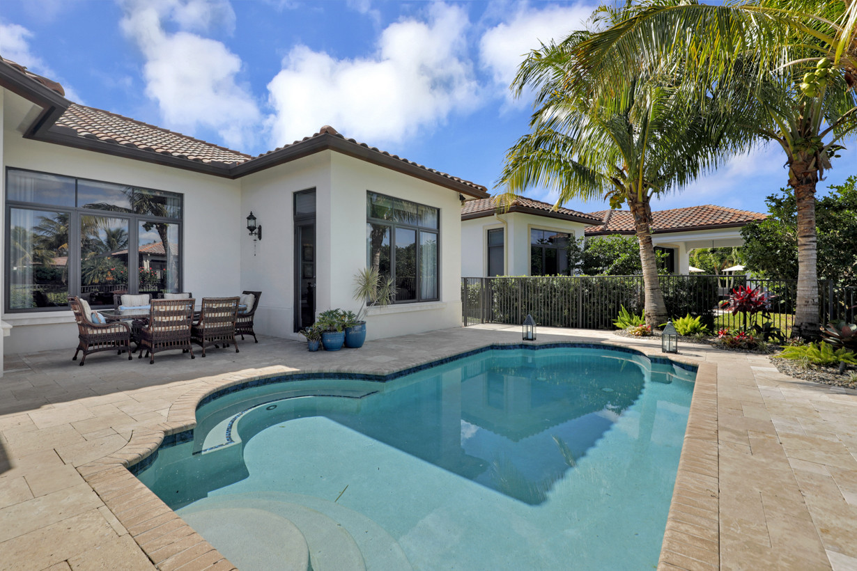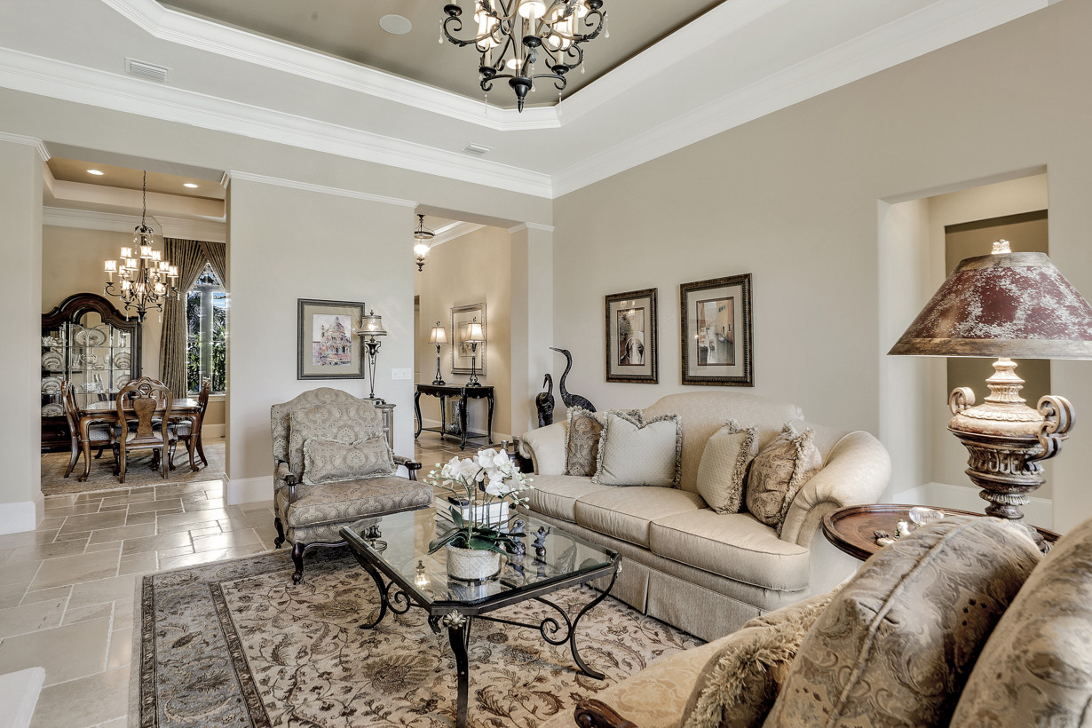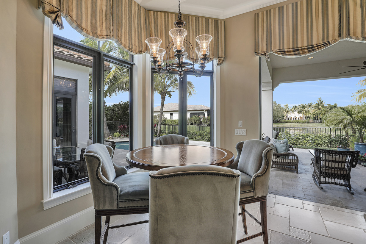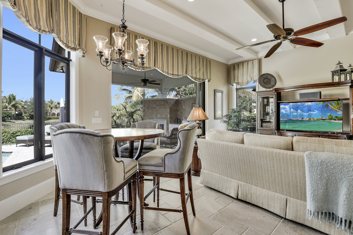 Lush tropical landscaping with palm tree up-lighting resides on deep, over-sized lot and has bonus Cul-De-Sac green-space median! Multiple upgrades include expanded marble lanai deck with saltwater pool, gas fireplace and grill. Surround sound and full outdoor kitchen among-st quiet, private setting and long lake views. Bright indoor kitchen flaunts gas cook-top, upgraded paneled appliances and cabinets with roll out shelves! Entertaining butlers pantry with wine storage and cooler. Master bath relaxes with massage spray system, large soaking tub, decorator tile accents and vanity! Large, quiet den has rich wood floors and plantation shutters. In addition, extended French limestone floors, crown molding, custom (electric) window treatments and draperies, custom closets, On Q wiring system and fresh paint! Impact windows and doors plus roof strengthening tie down and clip package. Functional 2 1/2 car garage with A/C, cabinets, electric bike lift and new epoxy floor! World class golf and Country Club!