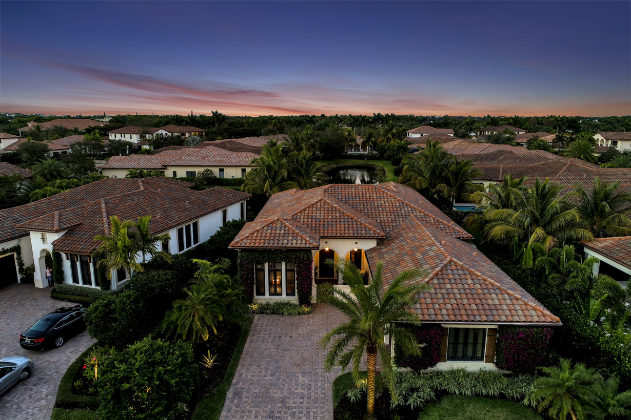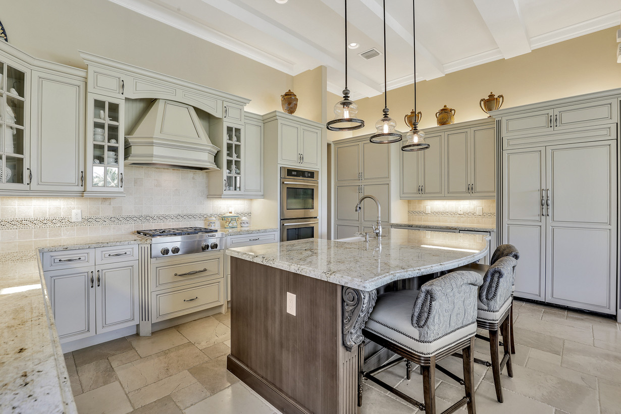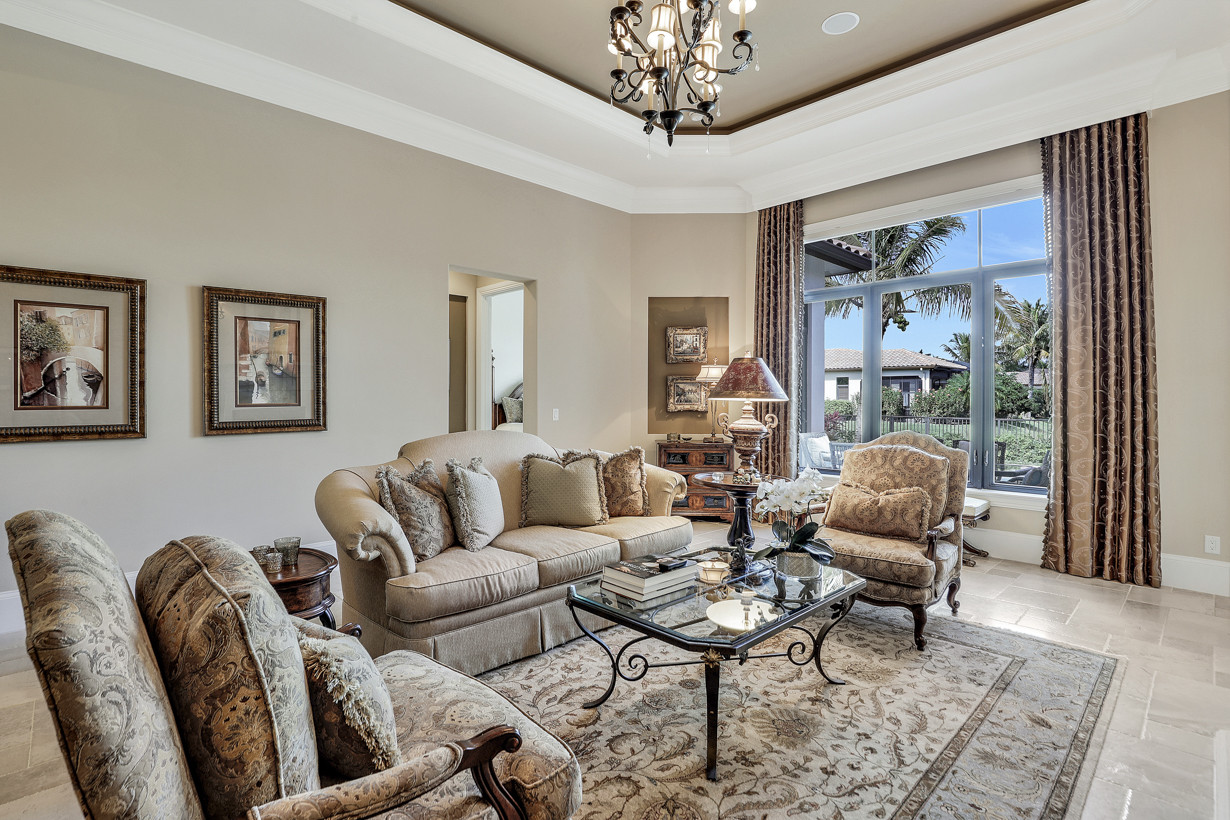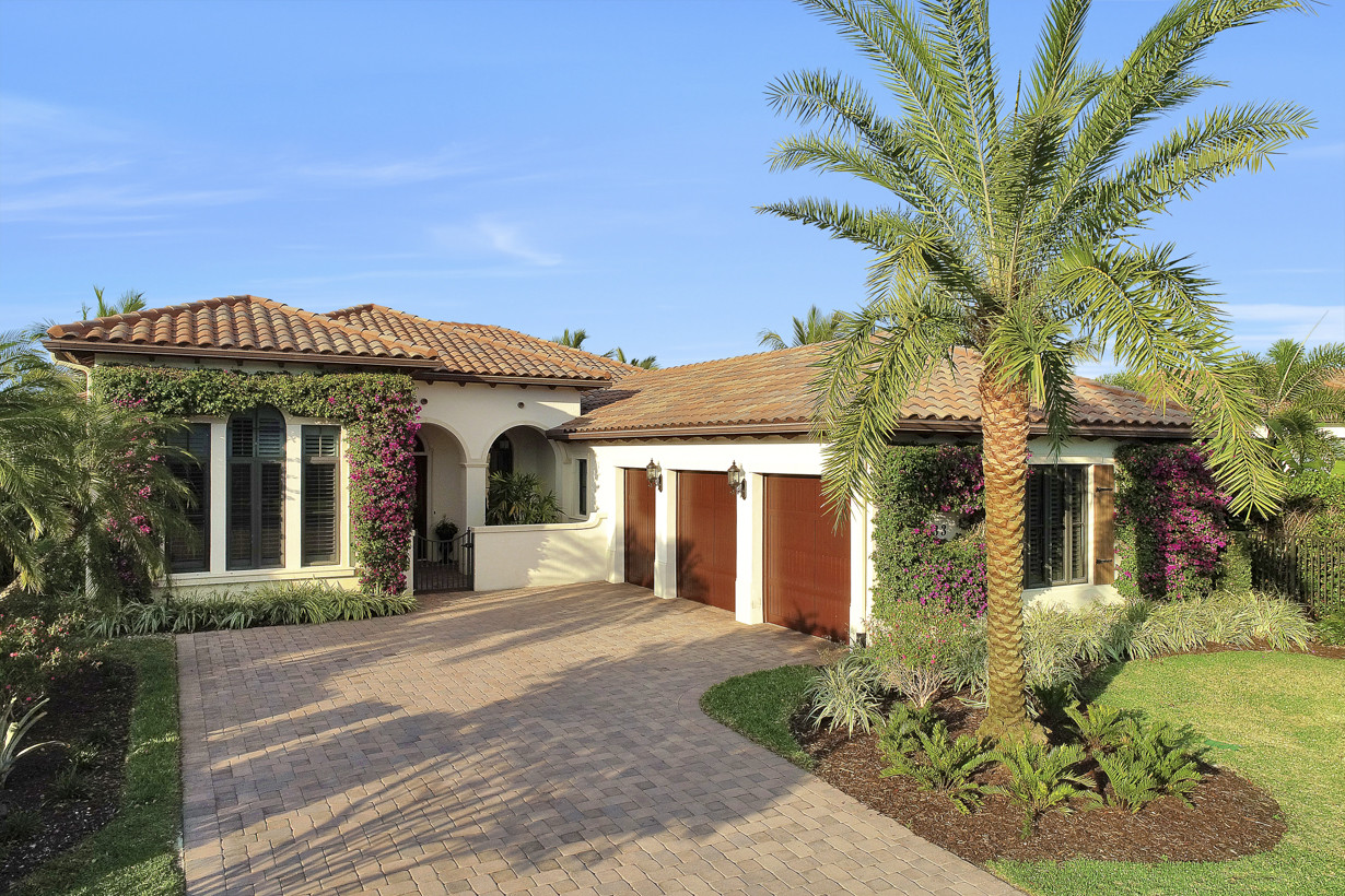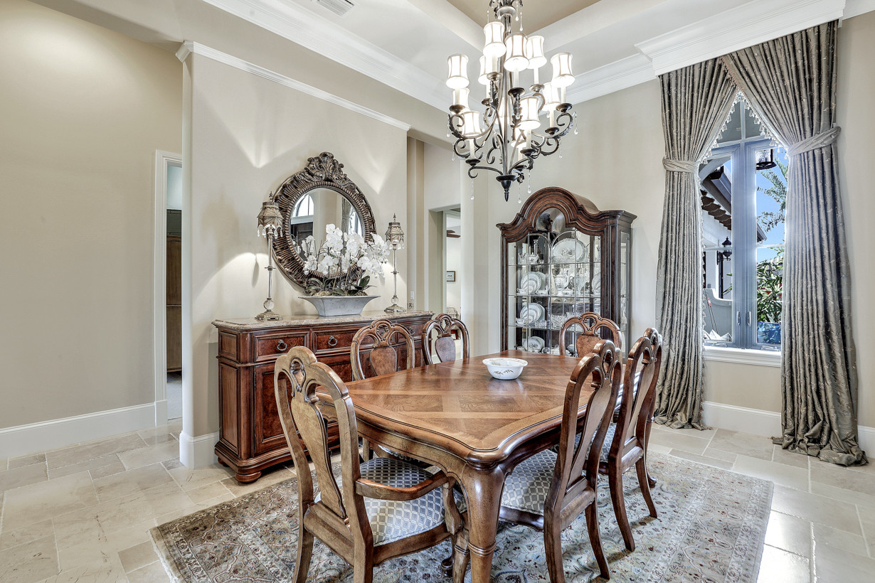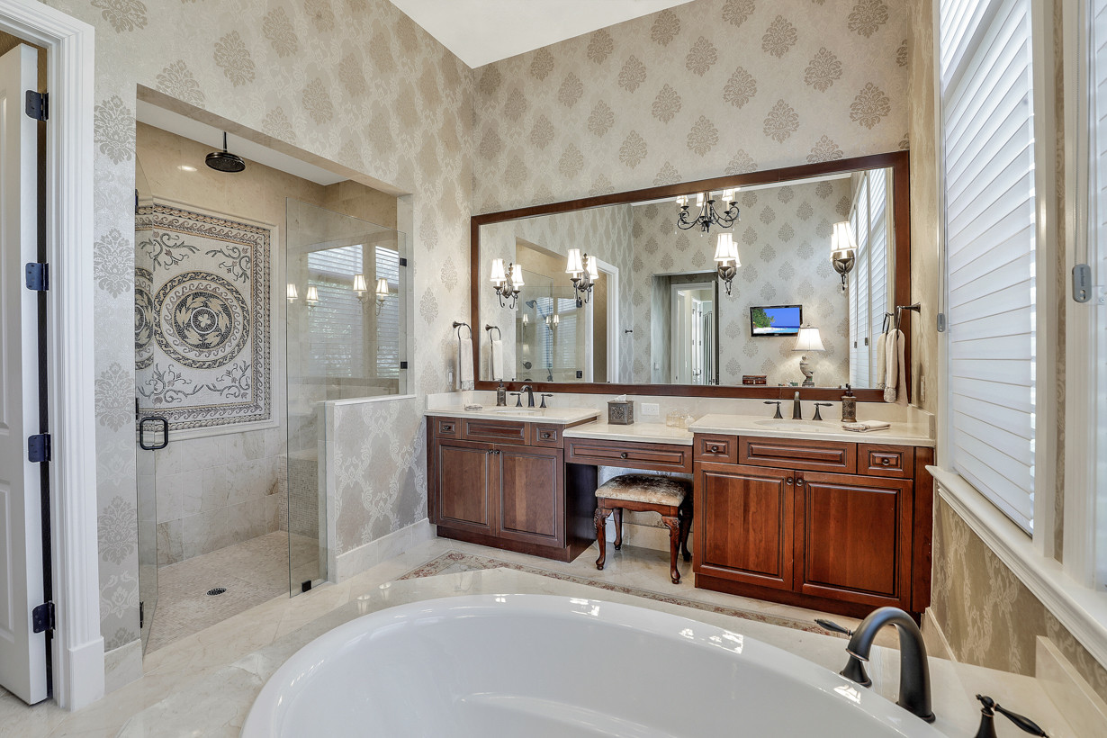 Lush tropical landscaping with palm tree up-lighting resides on deep, over-sized lot and has bonus Cul-De-Sac green-space median! Multiple upgrades include expanded marble lanai deck with saltwater pool, gas fireplace and grill. Surround sound and full outdoor kitchen among-st quiet, private setting and long lake views. Bright indoor kitchen flaunts gas cook-top, upgraded paneled appliances and cabinets with roll out shelves! Entertaining butlers pantry with wine storage and cooler. Master bath relaxes with massage spray system, large soaking tub, decorator tile accents and vanity! Large, quiet den has rich wood floors and plantation shutters. In addition, extended French limestone floors, crown molding, custom (electric) window treatments and draperies, custom closets, On Q wiring system and fresh paint! Impact windows and doors plus roof strengthening tie down and clip package. Functional 2 1/2 car garage with A/C, cabinets, electric bike lift and new epoxy floor! World class golf and Country Club!