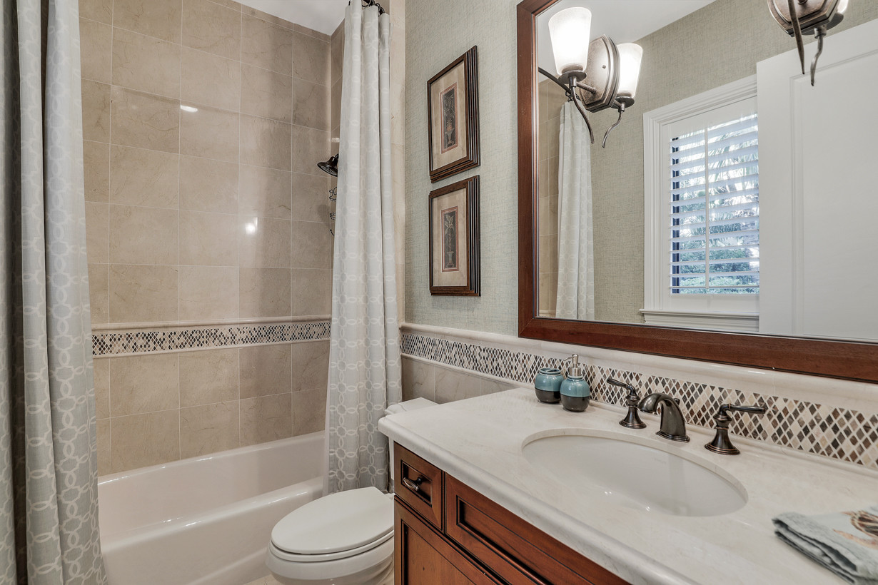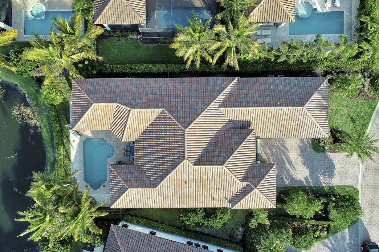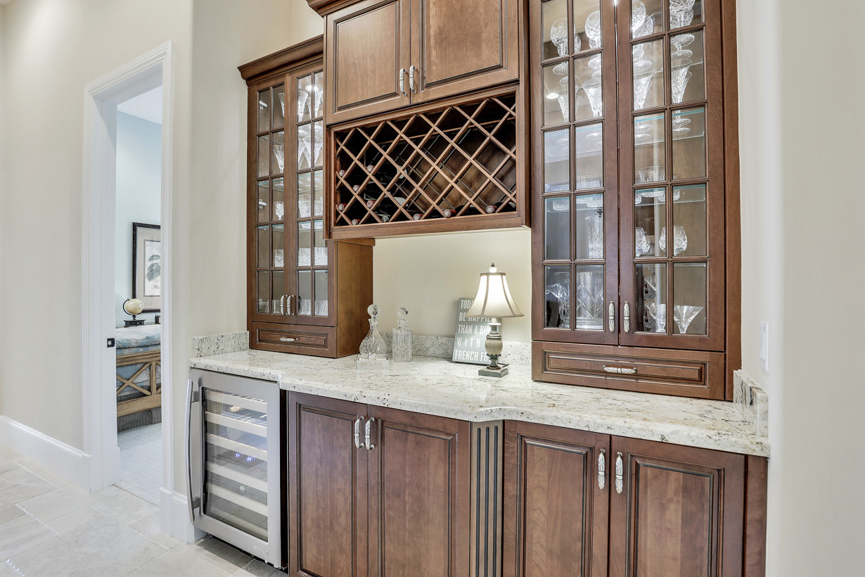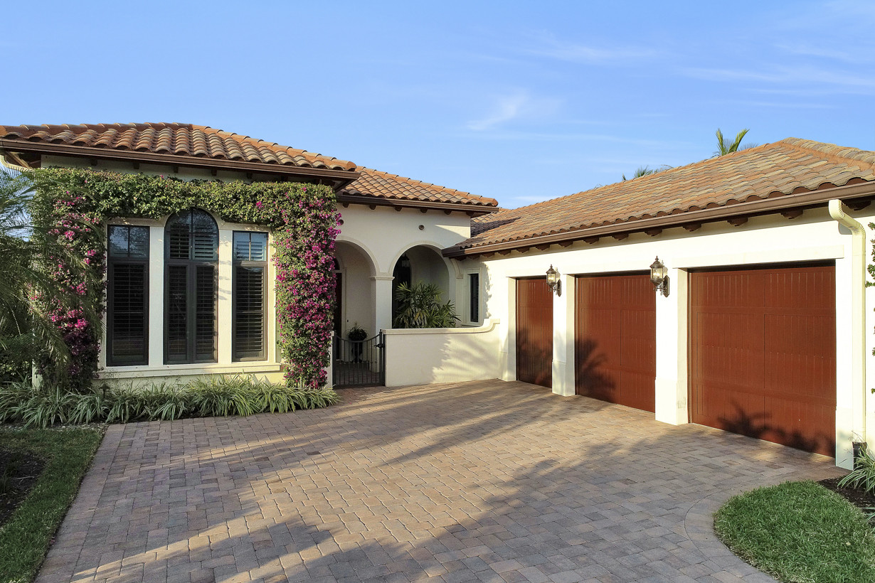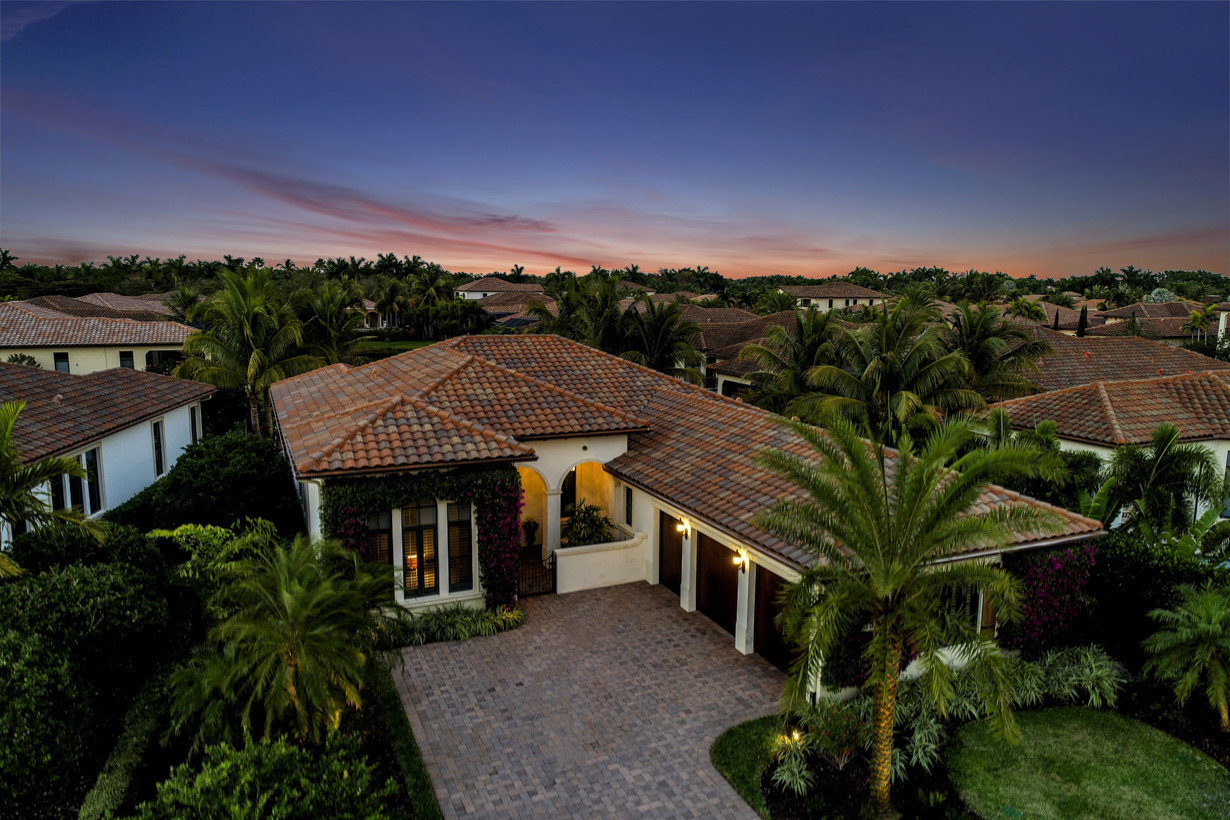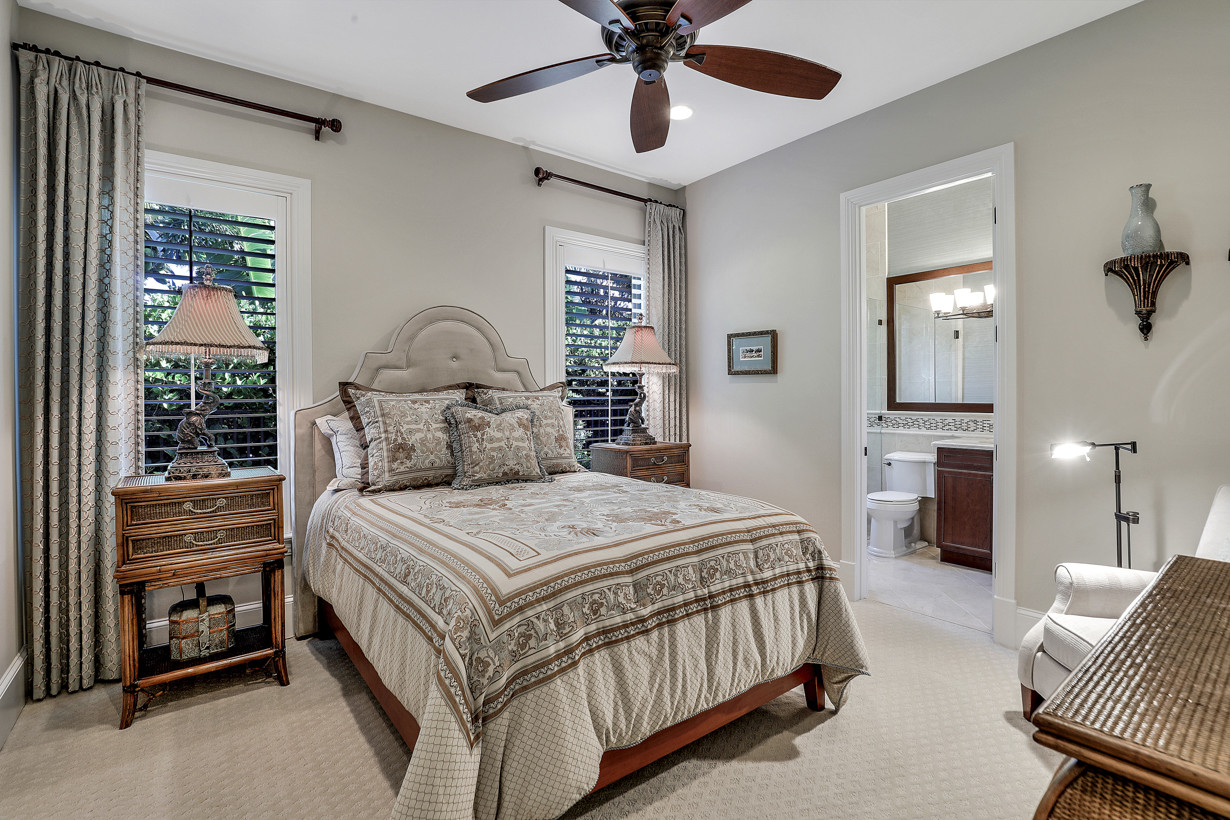 Lush tropical landscaping with palm tree up-lighting resides on deep, over-sized lot and has bonus Cul-De-Sac green-space median! Multiple upgrades include expanded marble lanai deck with saltwater pool, gas fireplace and grill. Surround sound and full outdoor kitchen among-st quiet, private setting and long lake views. Bright indoor kitchen flaunts gas cook-top, upgraded paneled appliances and cabinets with roll out shelves! Entertaining butlers pantry with wine storage and cooler. Master bath relaxes with massage spray system, large soaking tub, decorator tile accents and vanity! Large, quiet den has rich wood floors and plantation shutters. In addition, extended French limestone floors, crown molding, custom (electric) window treatments and draperies, custom closets, On Q wiring system and fresh paint! Impact windows and doors plus roof strengthening tie down and clip package. Functional 2 1/2 car garage with A/C, cabinets, electric bike lift and new epoxy floor! World class golf and Country Club!